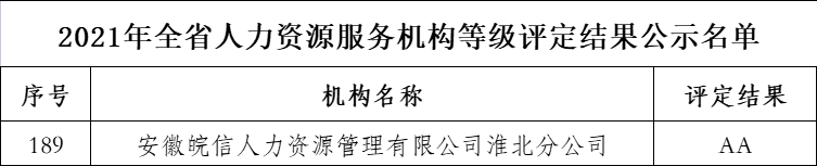 歷經(jīng)長達(dá)3個月的縣、市、省層層評定工作后,通過基礎(chǔ)條件、服務(wù)規(guī)范、組織建設(shè)、服務(wù)業(yè)績、服務(wù)效益等方面的評比,2021年12月17日安徽省人力資源和社會保障廳發(fā)布的《2021年全省人力資源服務(wù)機(jī)構(gòu)等級評定結(jié)果公示》中,安徽皖信人力資源管理有限公司淮北分公司榮獲“AA”級人力資源服務(wù)機(jī)構(gòu)榮譽(yù)稱號。(公示如下圖)