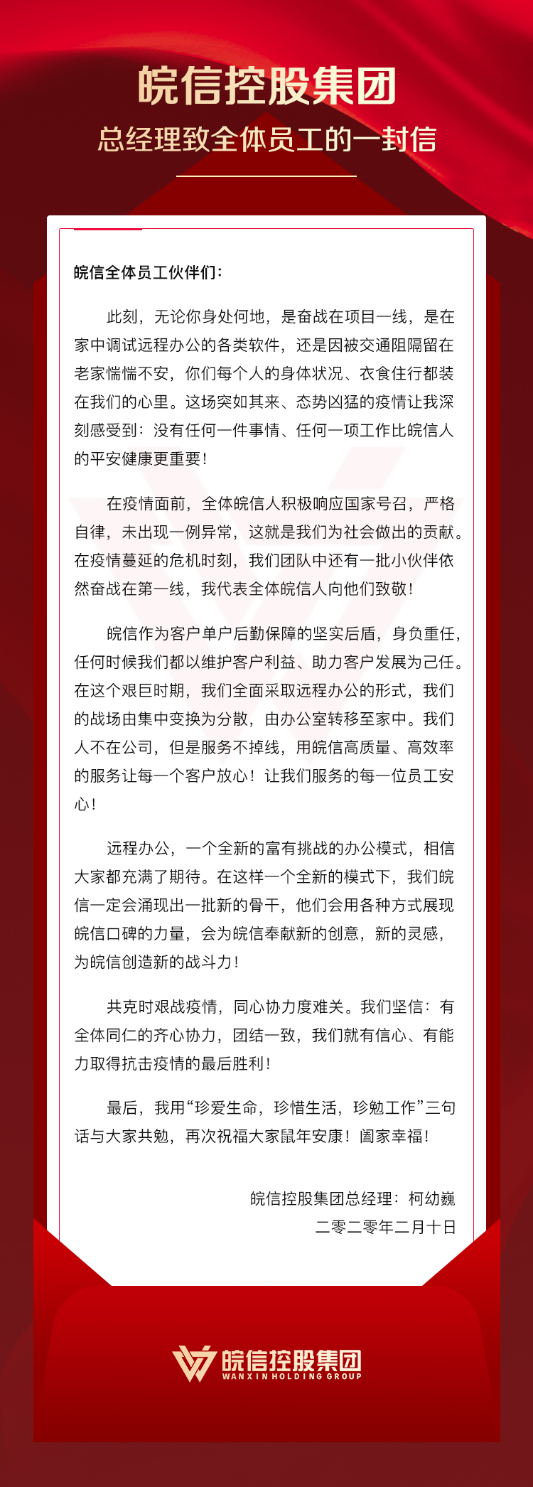 一早,集團(tuán)總經(jīng)理柯幼巍女士向全體員工下發(fā)了《皖信控股集團(tuán)總經(jīng)理致全體員工的一封信》。信上,柯總對(duì)全體員工的健康安全表達(dá)了深切的關(guān)心,對(duì)疫情期間全體皖信人嚴(yán)格自律未出現(xiàn)一例異常感到欣慰,對(duì)奮戰(zhàn)在第一線(xiàn)的小伙伴表達(dá)了深刻的敬意,對(duì)遠(yuǎn)程辦公依然能為客戶(hù)提供高質(zhì)量、高效率的服務(wù)表達(dá)了殷切的期待,對(duì)皖信全體同仁齊心協(xié)力取得抗擊疫情的最后勝利表達(dá)了充分的信心。