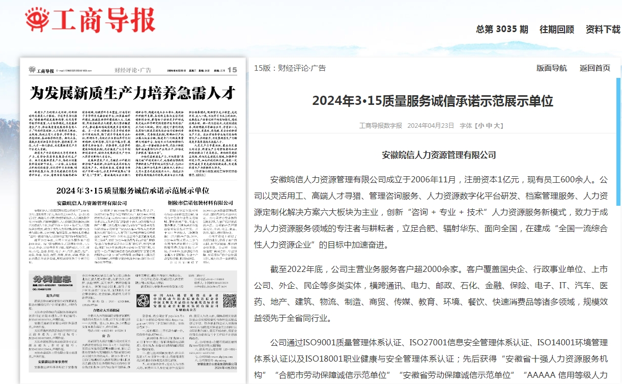 近日,在工商導(dǎo)報(bào)社和安徽經(jīng)濟(jì)新聞網(wǎng)聯(lián)合發(fā)起的“2024年3·15質(zhì)量服務(wù)誠信承諾示范單位”評選活動(dòng)中,安徽皖信人力資源管理有限公司在眾多參選單位中脫穎而出,被授予“2024年3·15質(zhì)量服務(wù)誠信承諾示范單位”,并在《工商導(dǎo)報(bào)》上刊登出版,這一榮譽(yù)的獲得,是對皖信人力長期以來堅(jiān)持誠信經(jīng)營,提供優(yōu)質(zhì)服務(wù)的充分肯定。