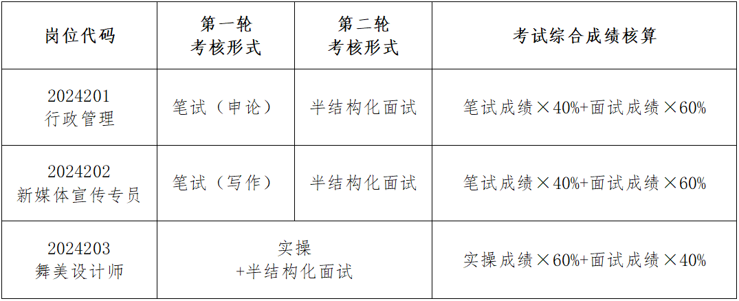 1.根據(jù)各崗位要求設(shè)置相應(yīng)的考試方式。第一輪和第二輪成績(jī)均為百分制,考核方式及計(jì)算方法如下: