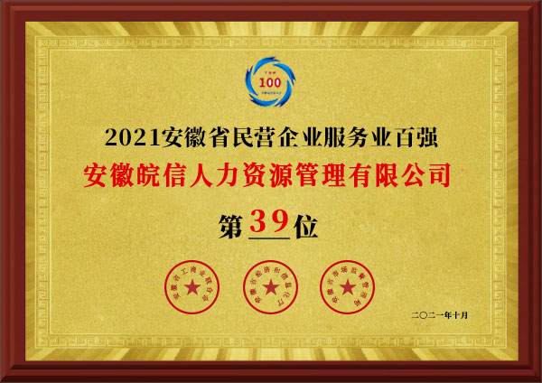 2021年安徽省民營企業(yè)服務(wù)業(yè)百強第39位