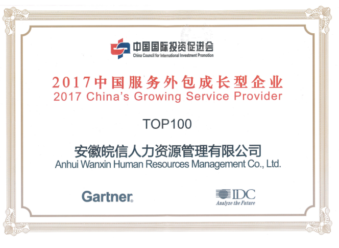 安徽皖信人力資源管理有限公司受邀參加本次大會,并榮獲大會頒發(fā)的“2017中國服務(wù)外包百強成長型企業(yè)”稱號。至此,安徽皖信已連續(xù)兩次獲得此項榮譽。
