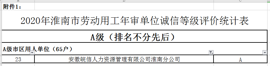 2020年9月,淮南市人力資源和社會(huì)保障局根據(jù)《安徽省用人單位勞動(dòng)保障守法誠(chéng)信等級(jí)評(píng)價(jià)實(shí)施辦法》(皖人社秘〔2016〕395號(hào))規(guī)定、《關(guān)于開(kāi)展2020年度勞動(dòng)保障書(shū)面審查和誠(chéng)信等級(jí)評(píng)價(jià)工作的通知》(淮人社發(fā)〔2020〕79號(hào))文件要求,結(jié)合對(duì)淮南市用人單位開(kāi)展遵守勞動(dòng)保障法律、法規(guī)書(shū)面審查和專(zhuān)項(xiàng)檢查、日常巡查、舉報(bào)投訴查處的情況,經(jīng)申報(bào)、審核、實(shí)地考察等程序現(xiàn)授予安徽皖信人力資源管理有限公司淮南分公司在2020年用人單位勞動(dòng)保障誠(chéng)信等級(jí)評(píng)定中獲得“A”級(jí)等級(jí)評(píng)定。