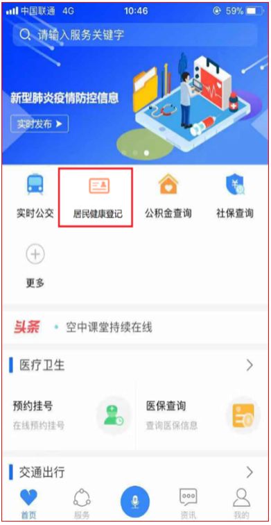 打開“合肥通”App,找到首頁“居民健康登記”,點擊打開信息登記頁面,填寫信息。